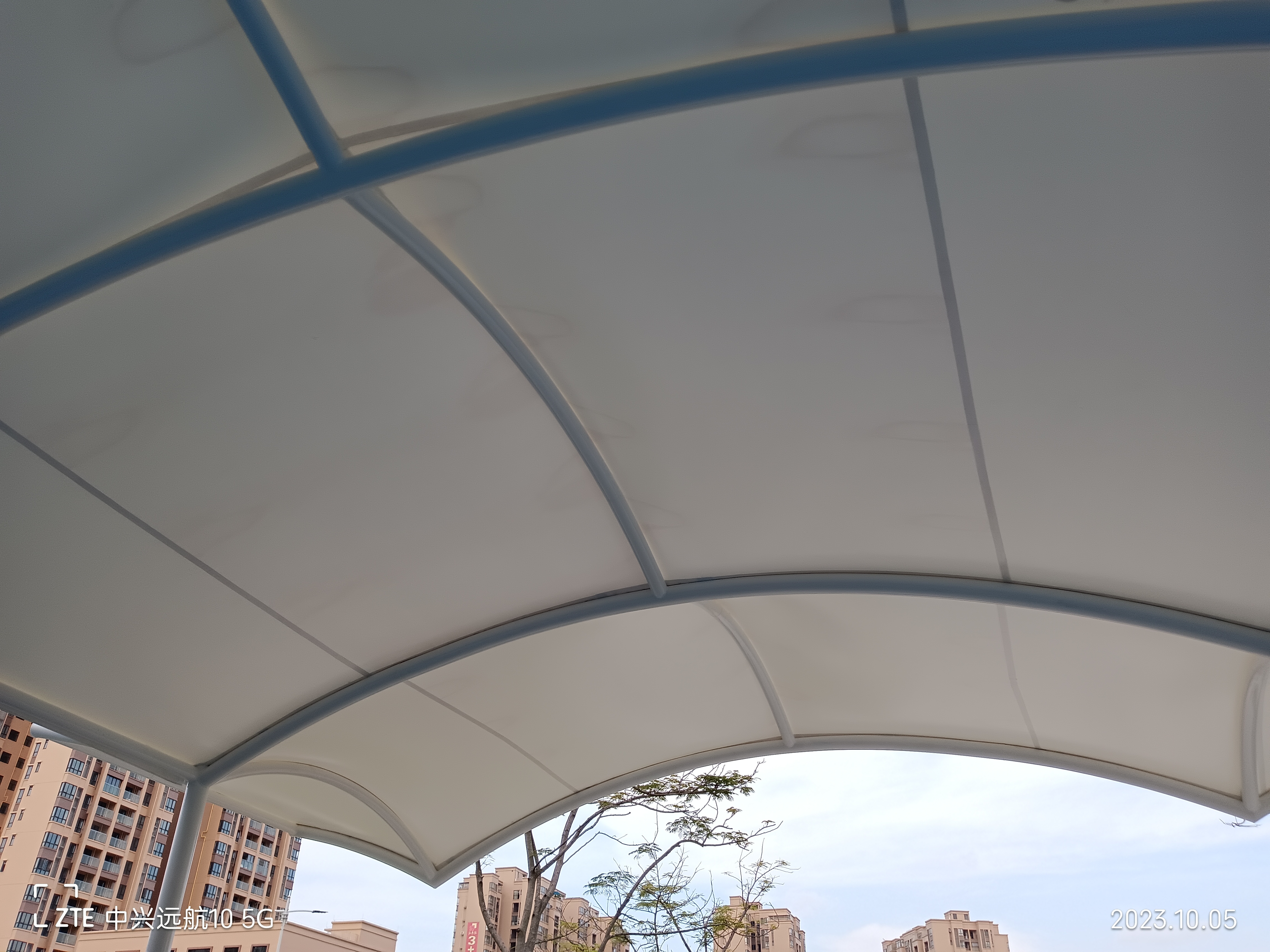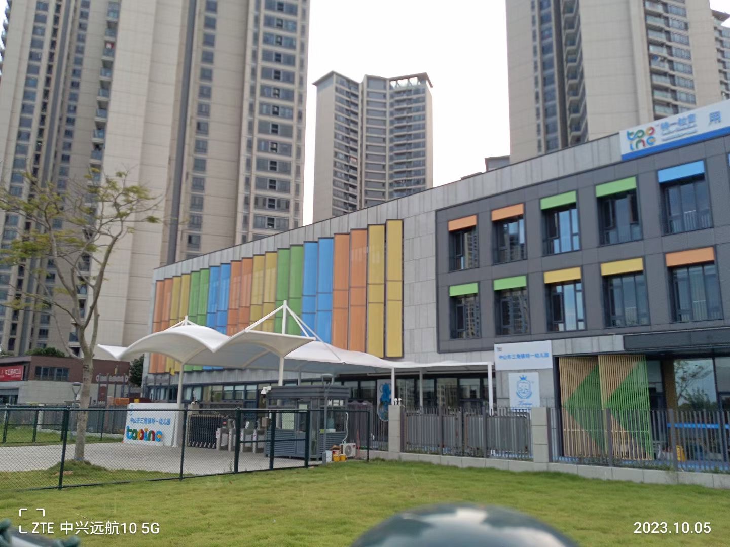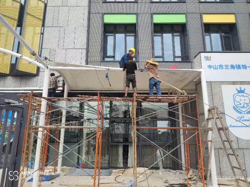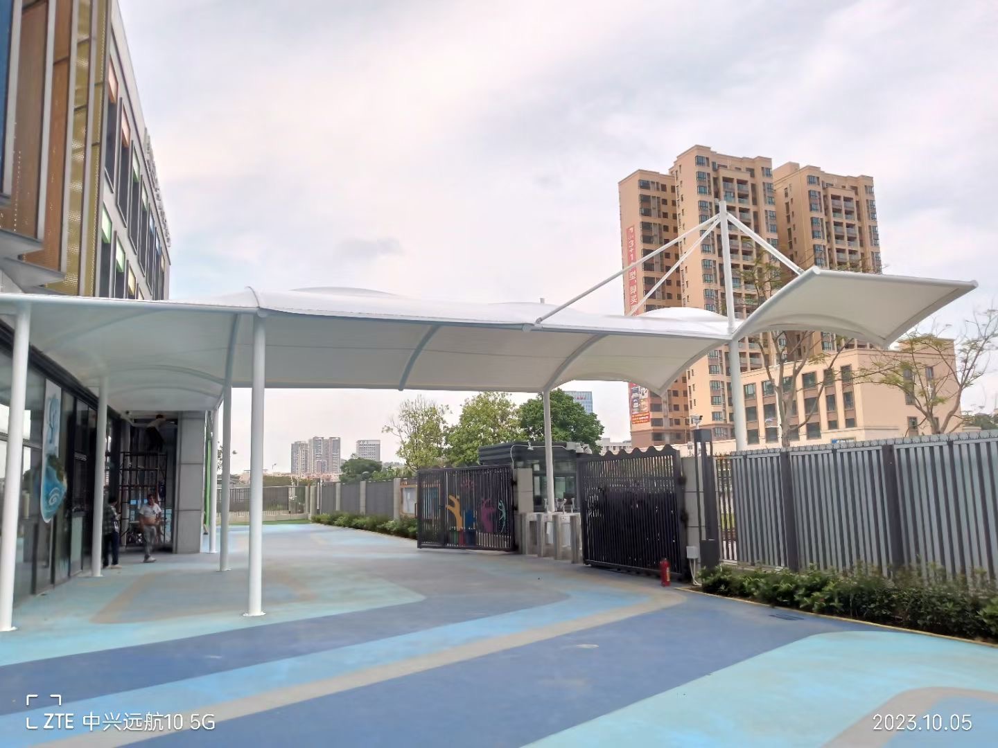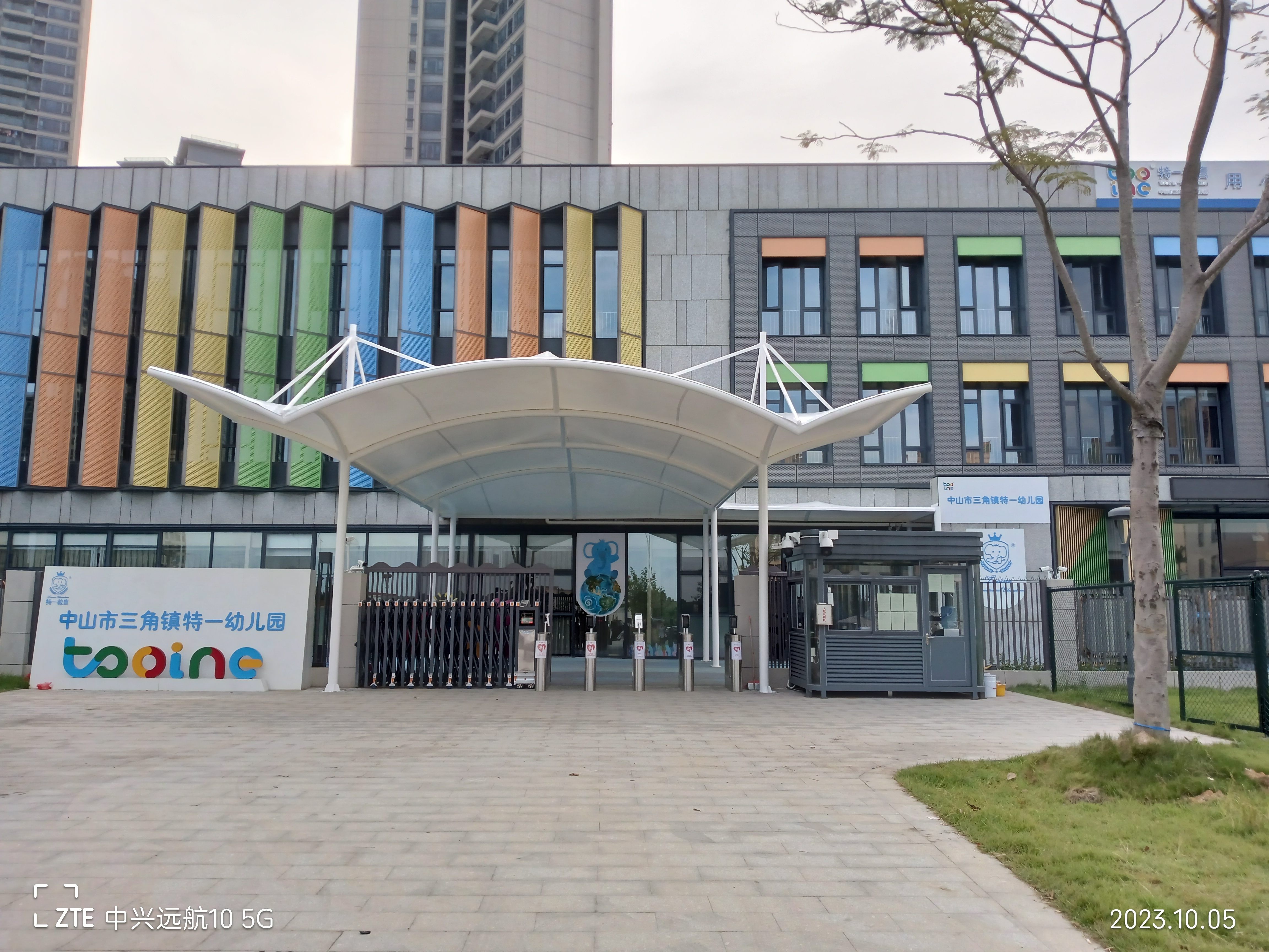 三角鎮特一幼兒園位于廣東省中山市三角鎮孝福路3號上筑雅苑,幼兒園大門口及通往教學樓雨棚采用膜結構雨棚,案例如下: