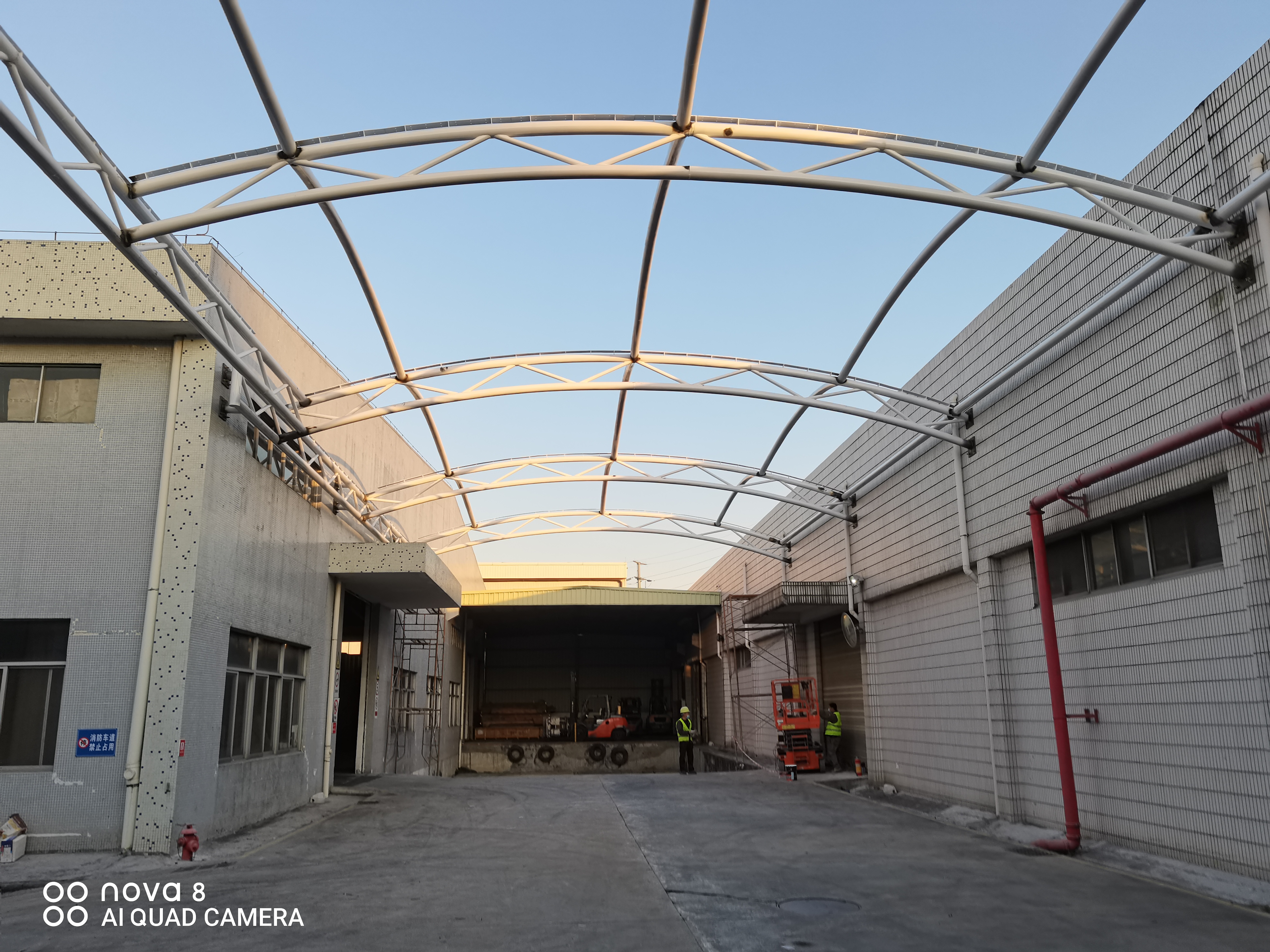 永豐余紙業(廣州)有限公司位于廣東省廣州市黃埔區夏園路5號,是方便裝卸原材料建設的走廊天幕,位于兩個生產車間之間,采用管桁架加膜結構雨棚。案例如下: