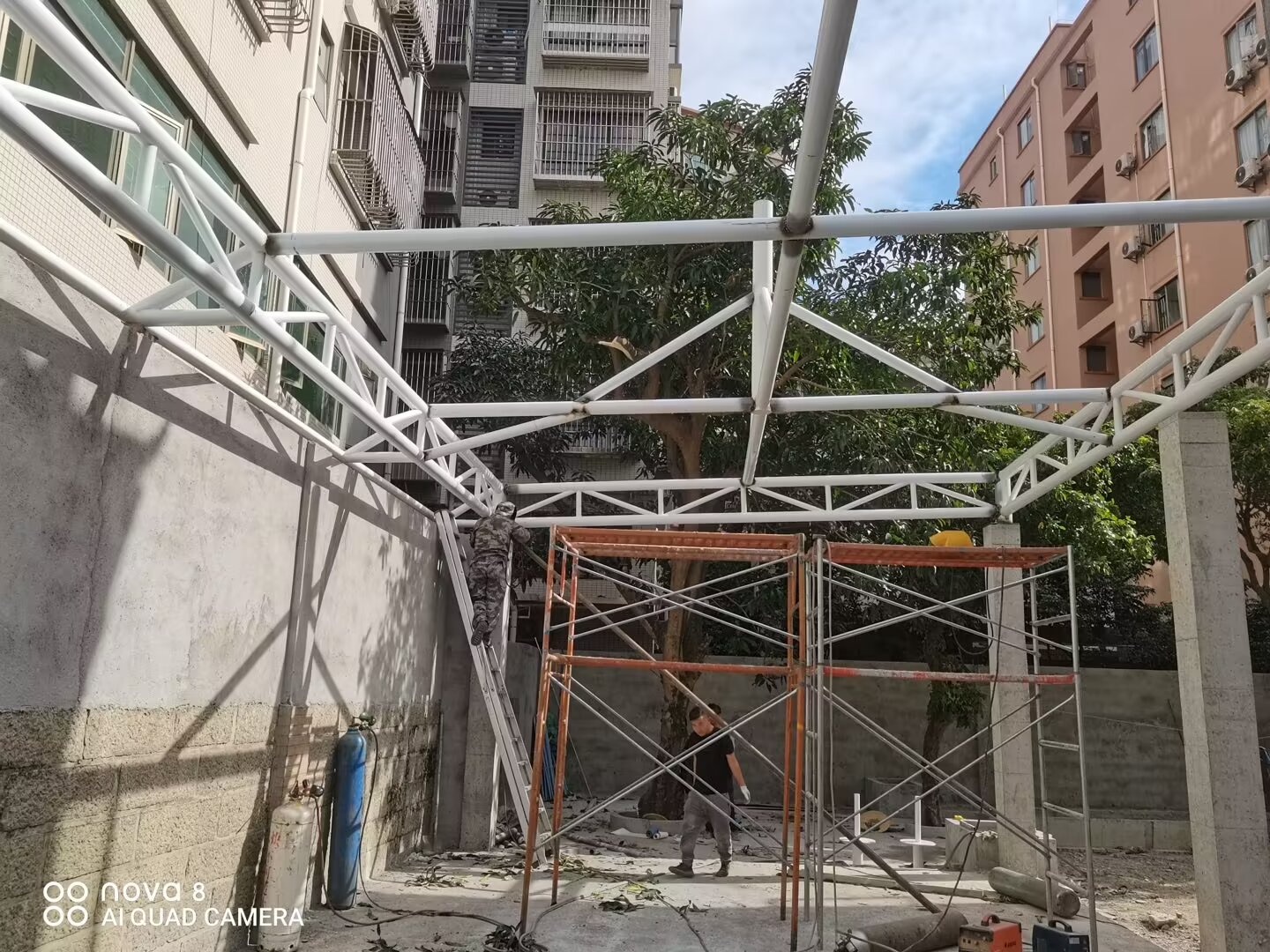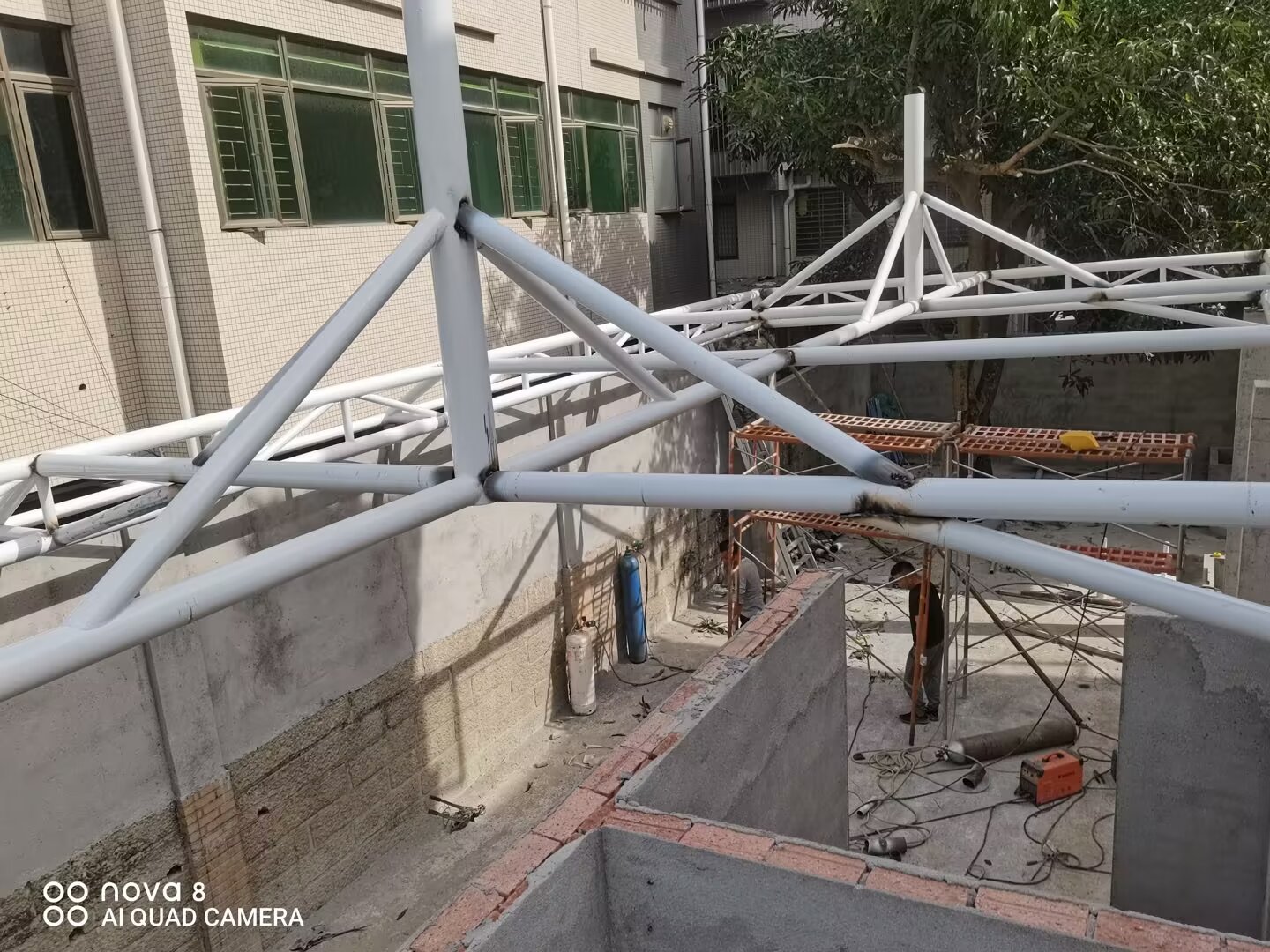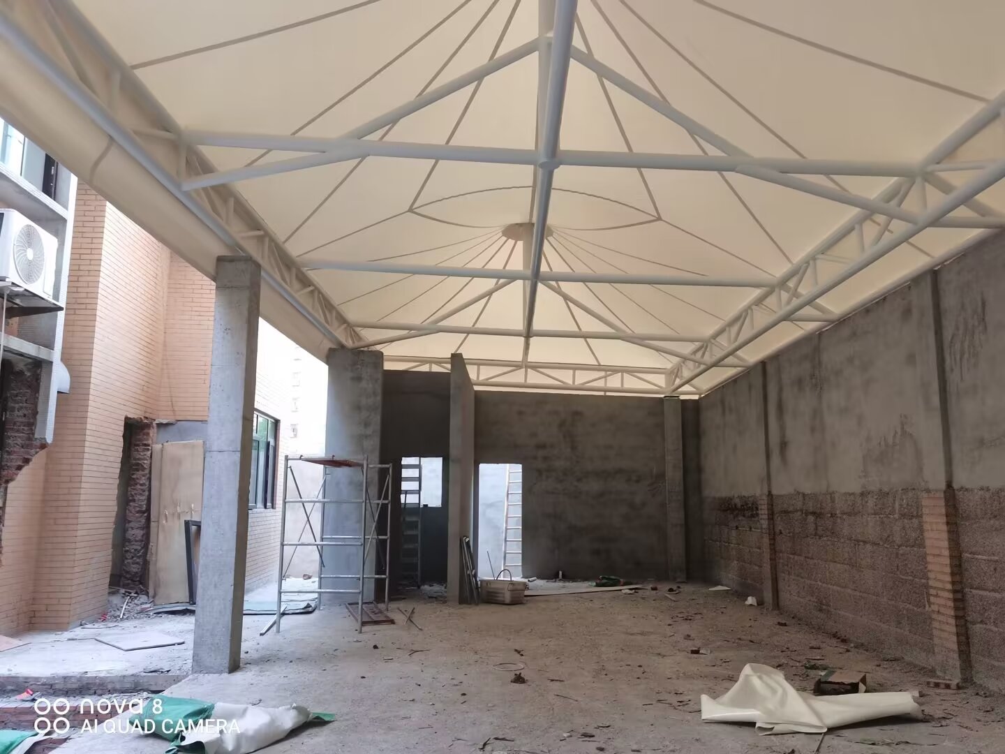 東莞別墅餐廳膜結(jié)構(gòu)雨棚是私人別墅做的餐廳雨棚項目,采用混凝土立柱加管桁架膜結(jié)構(gòu)雨棚,案例如下: