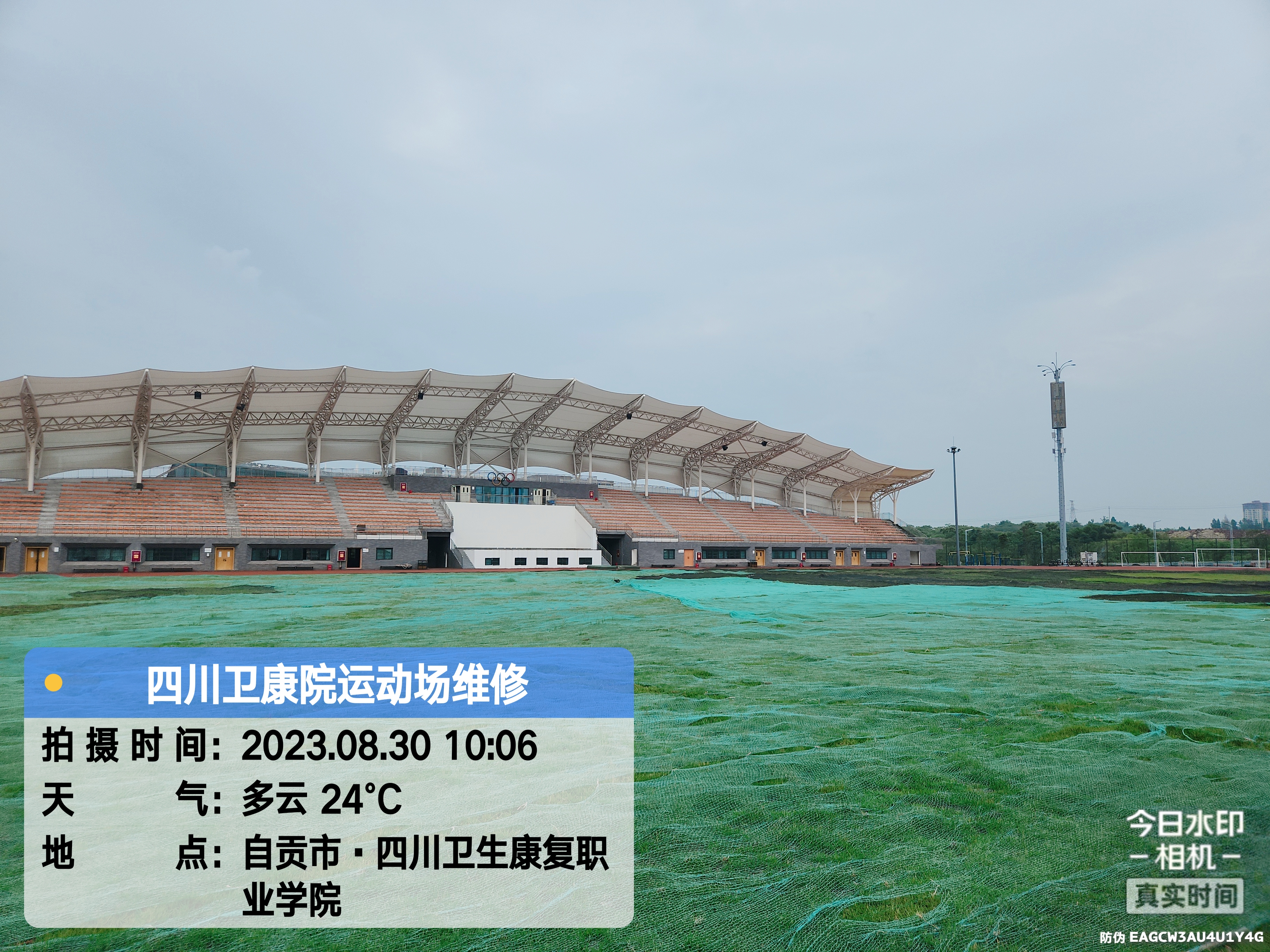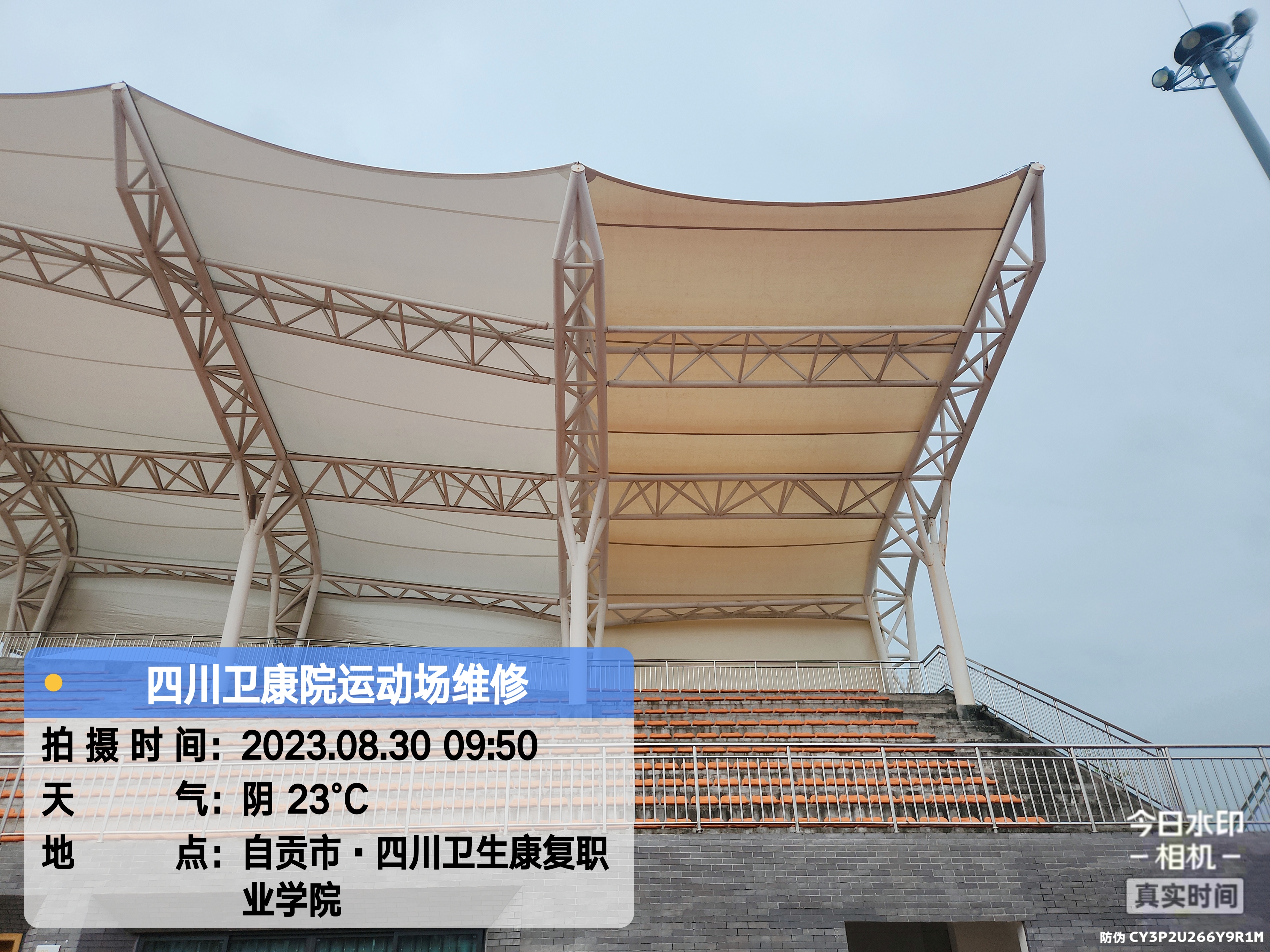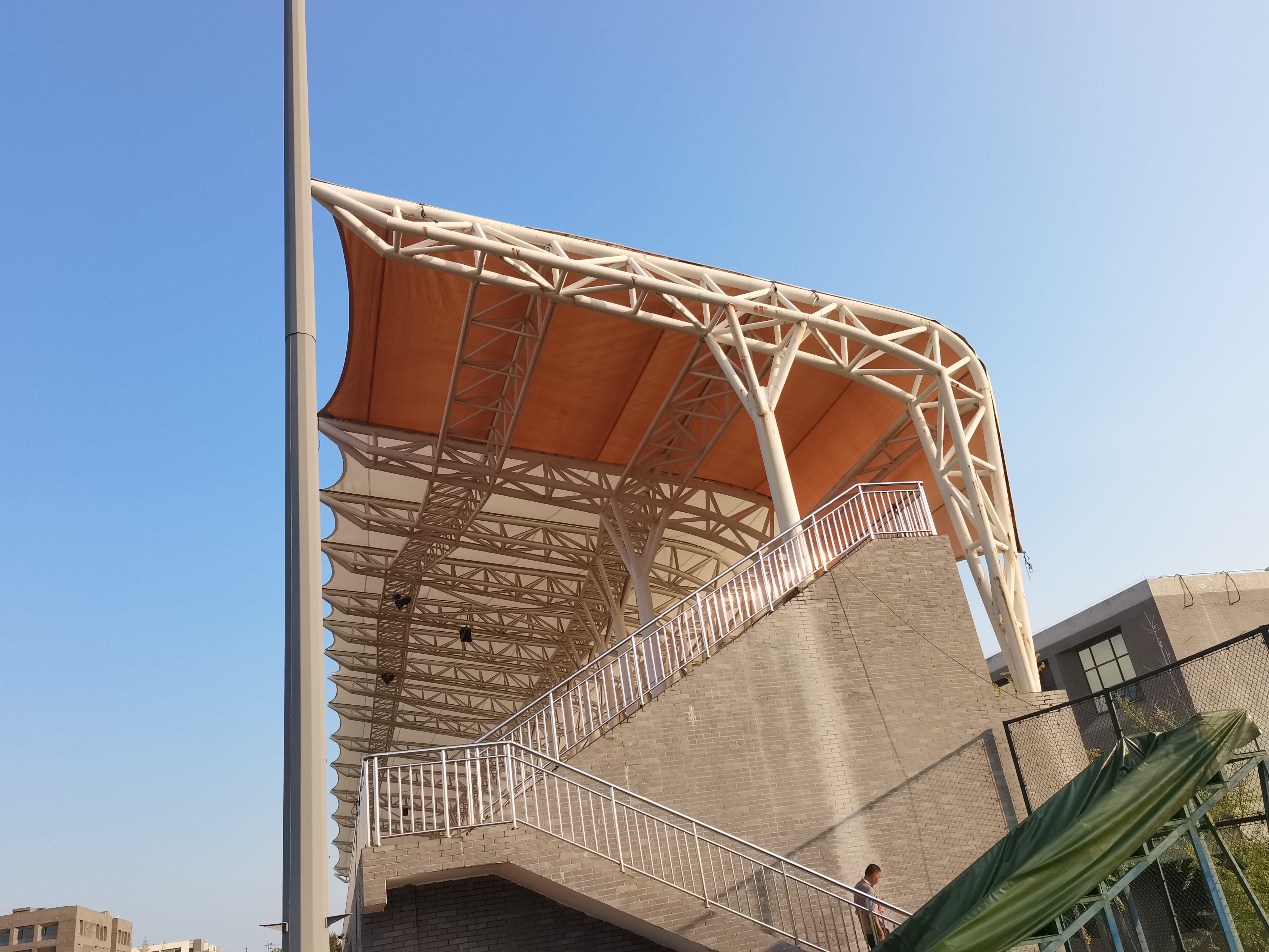 四川衛生康復職業學院位于四川省自貢市沿灘區仙市鎮德銘路3號,學院看臺采用鋼膜結構,膜結構采用PTFE玻璃纖維膜材,經過日照1-2月后變白,質保20年。施工案例如下: