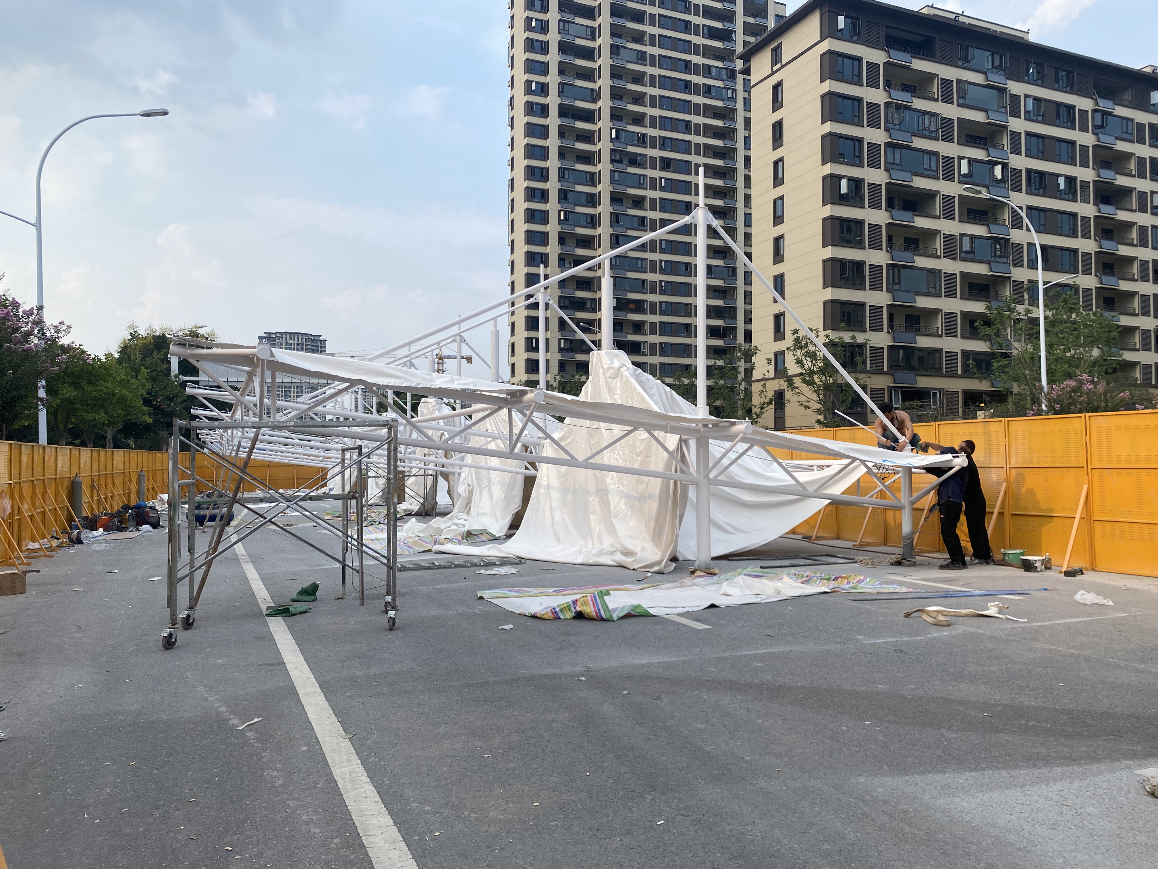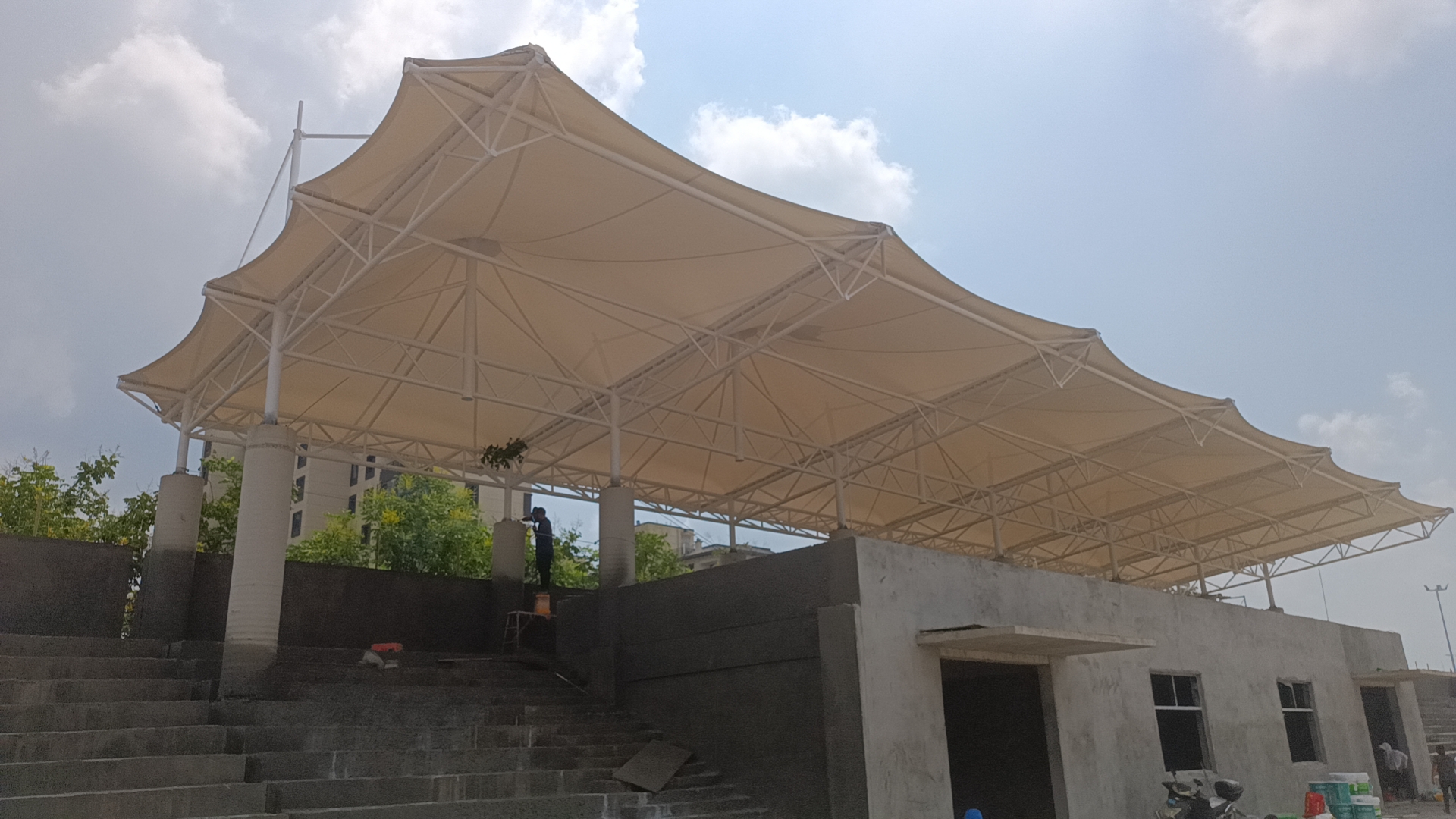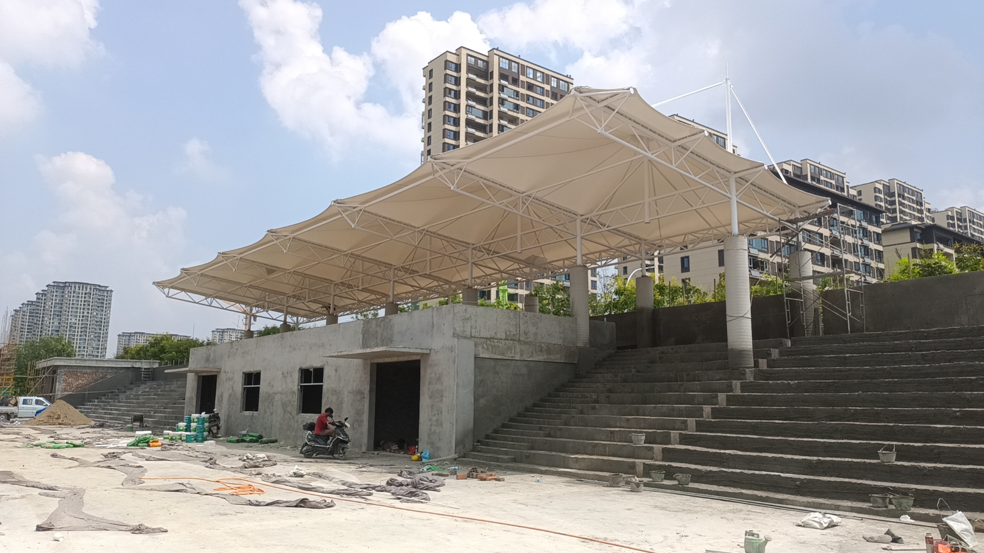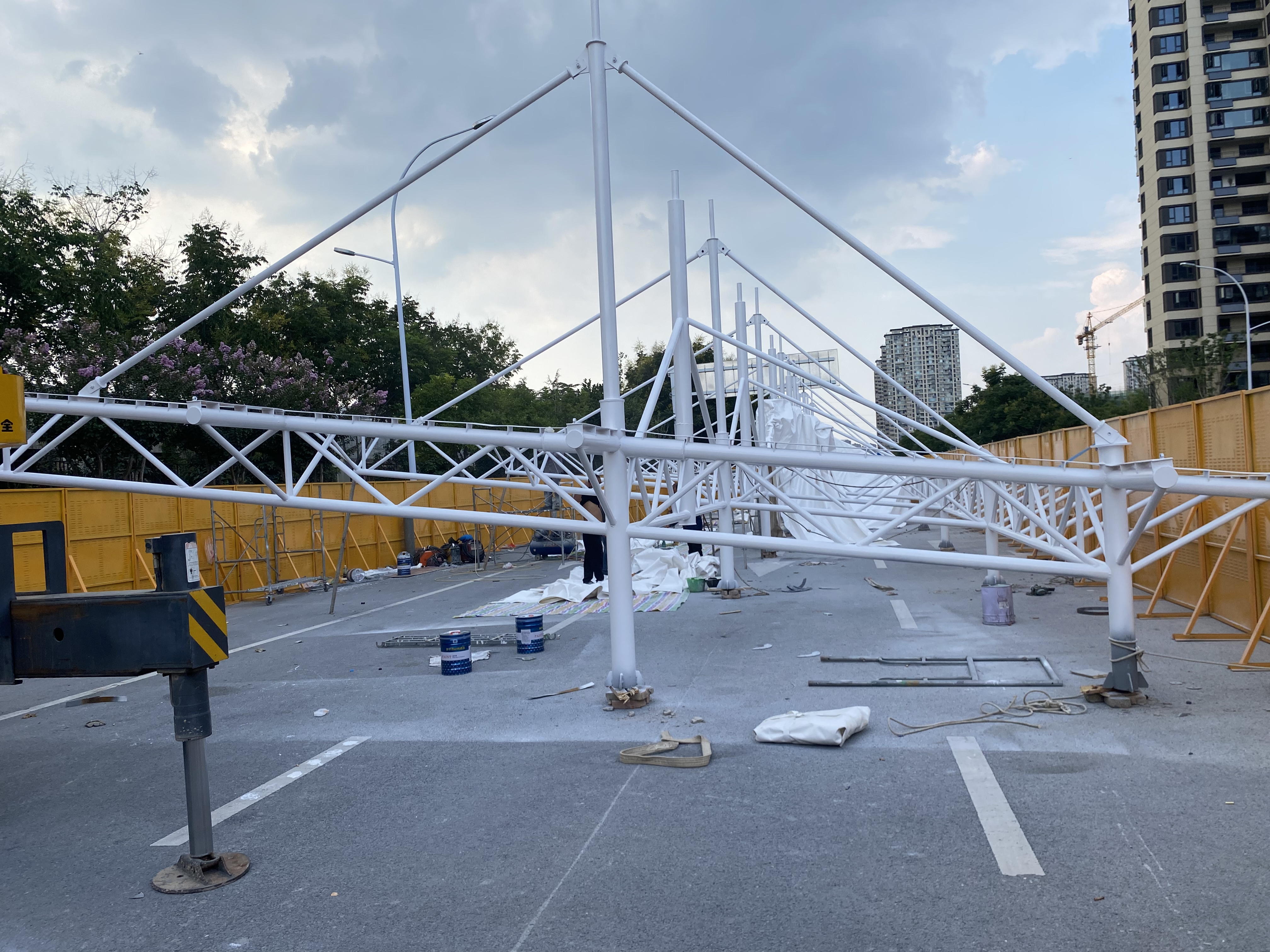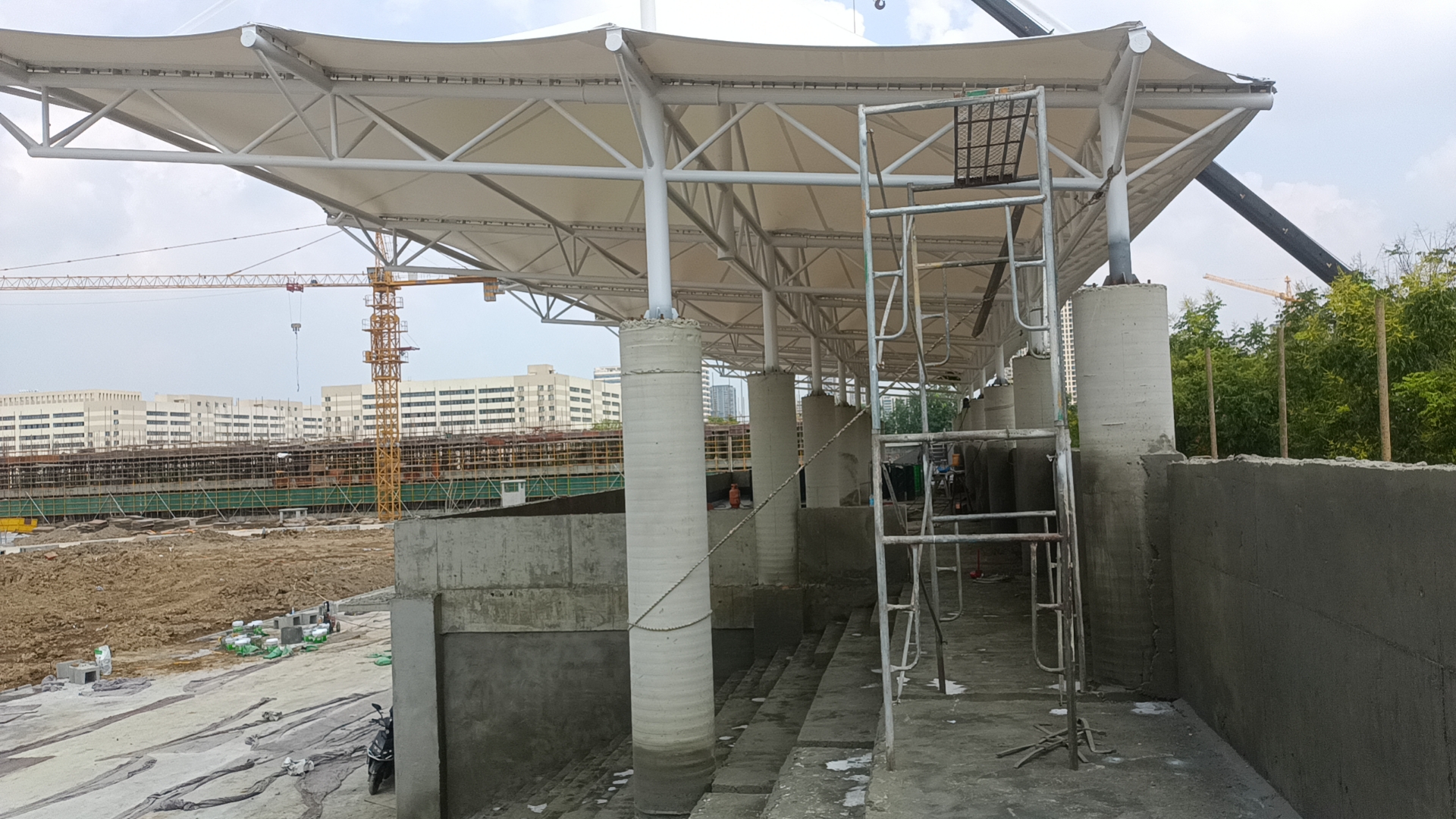 亳州市亳蕪高級(jí)中學(xué)看臺(tái)膜結(jié)構(gòu)工程采用鋼結(jié)構(gòu)加膜結(jié)構(gòu),鋼結(jié)構(gòu)采用桁架結(jié)構(gòu),雨棚結(jié)構(gòu)采用帽口造型。臨近開學(xué)時(shí)間,我公司加班加點(diǎn),施工方案是加工廠加工成半成本,現(xiàn)場只用一周時(shí)間就制作安裝完畢。